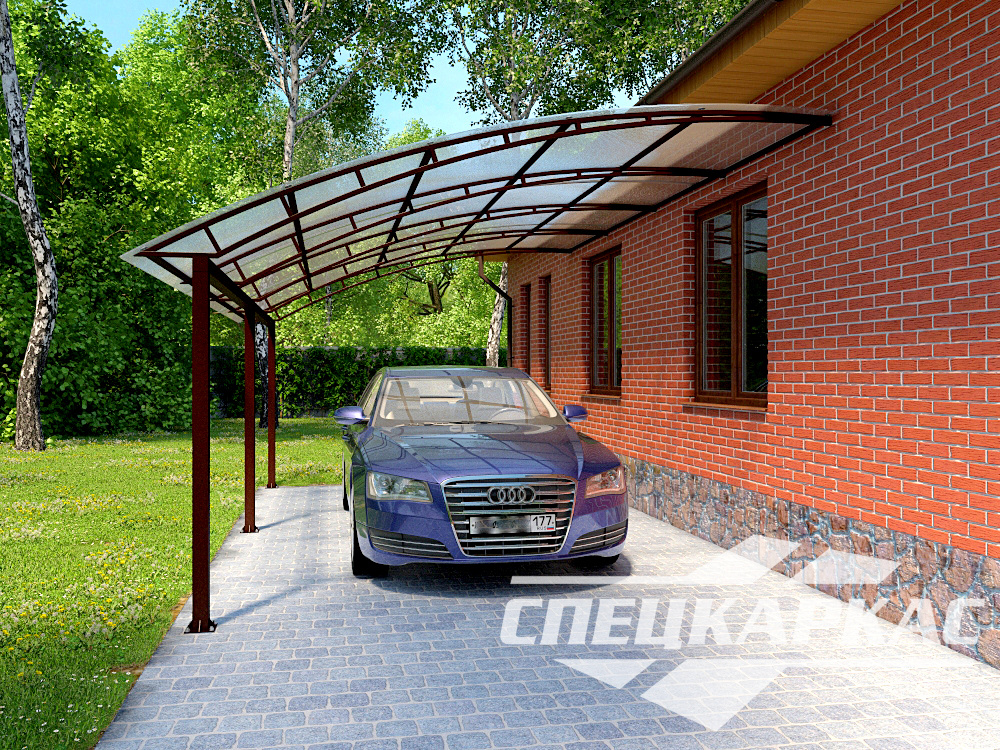 Оригинальная и стильная конструкция навеса для автомобилей «Барс» - лучшее решение для ценителей изящности и целостности архитектурной композиции участка.